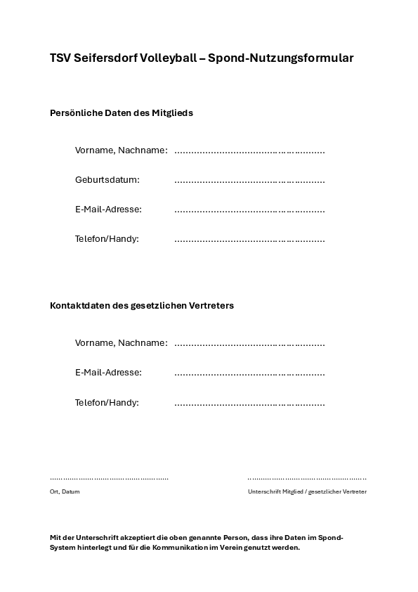Dafür benötigen wir bei minderjährigen Mitgliedern die Kontaktdaten eines gesetzlichen Vertreters, damit die Nutzung von Spond möglich ist, organisatorische Anliegen geklärt werden können und im Notfall eine schnelle Kontaktaufnahme gewährleistet ist.