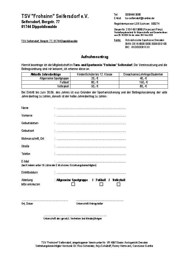 Wenn du bei uns Mitglied werden möchtest, fülle bitte die beiden untenstehenden Formulare vollständig aus. Anschließend kannst du sie entweder bei einem unserer Übungsleiter oder deinem bereits bekannten Ansprechpartner abgeben oder per E-Mail an volleyball@tsv-seifersdorf.de senden.